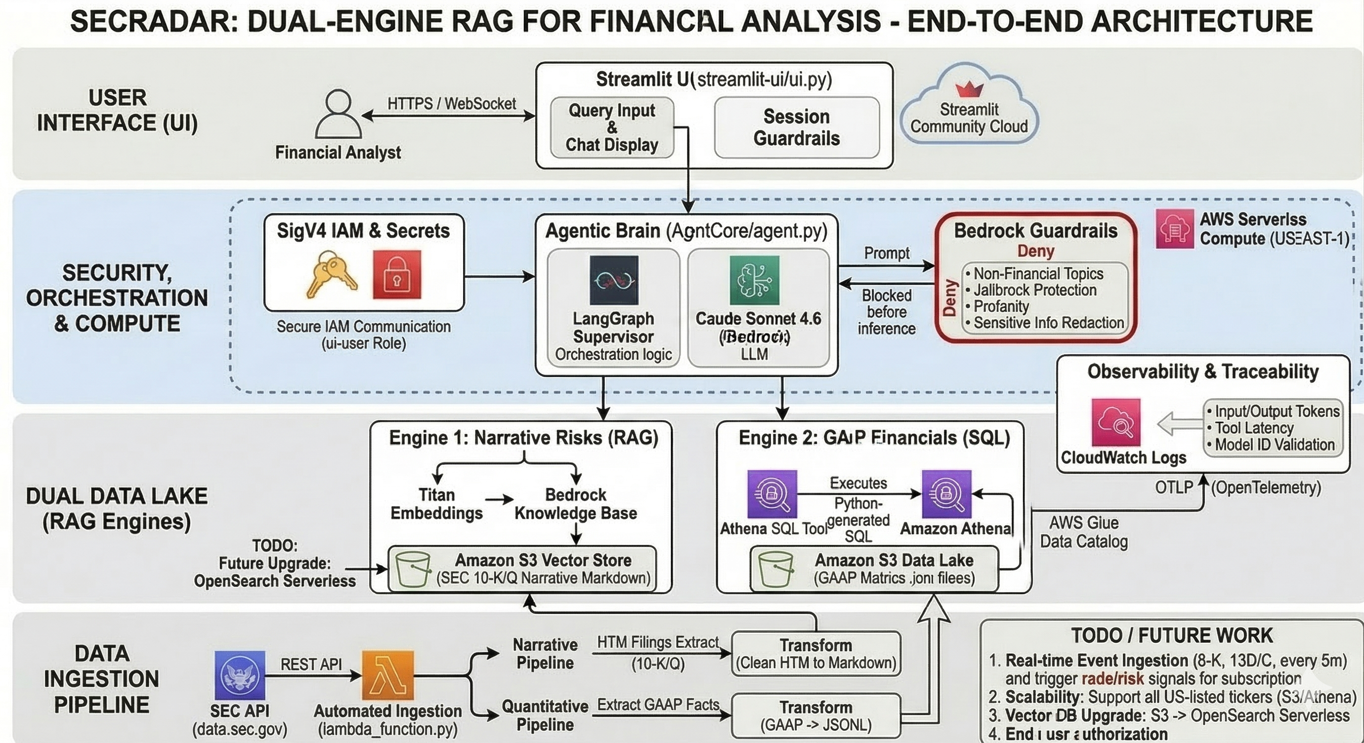 SecRadar is a personal project I built to explore the intersection of Generative AI, Data Lakes, and Financial Analytics. It is a humble attempt to solve a very real problem I've observed in the financial sector: the disconnect between raw quantitative data and qualitative corporate narratives.