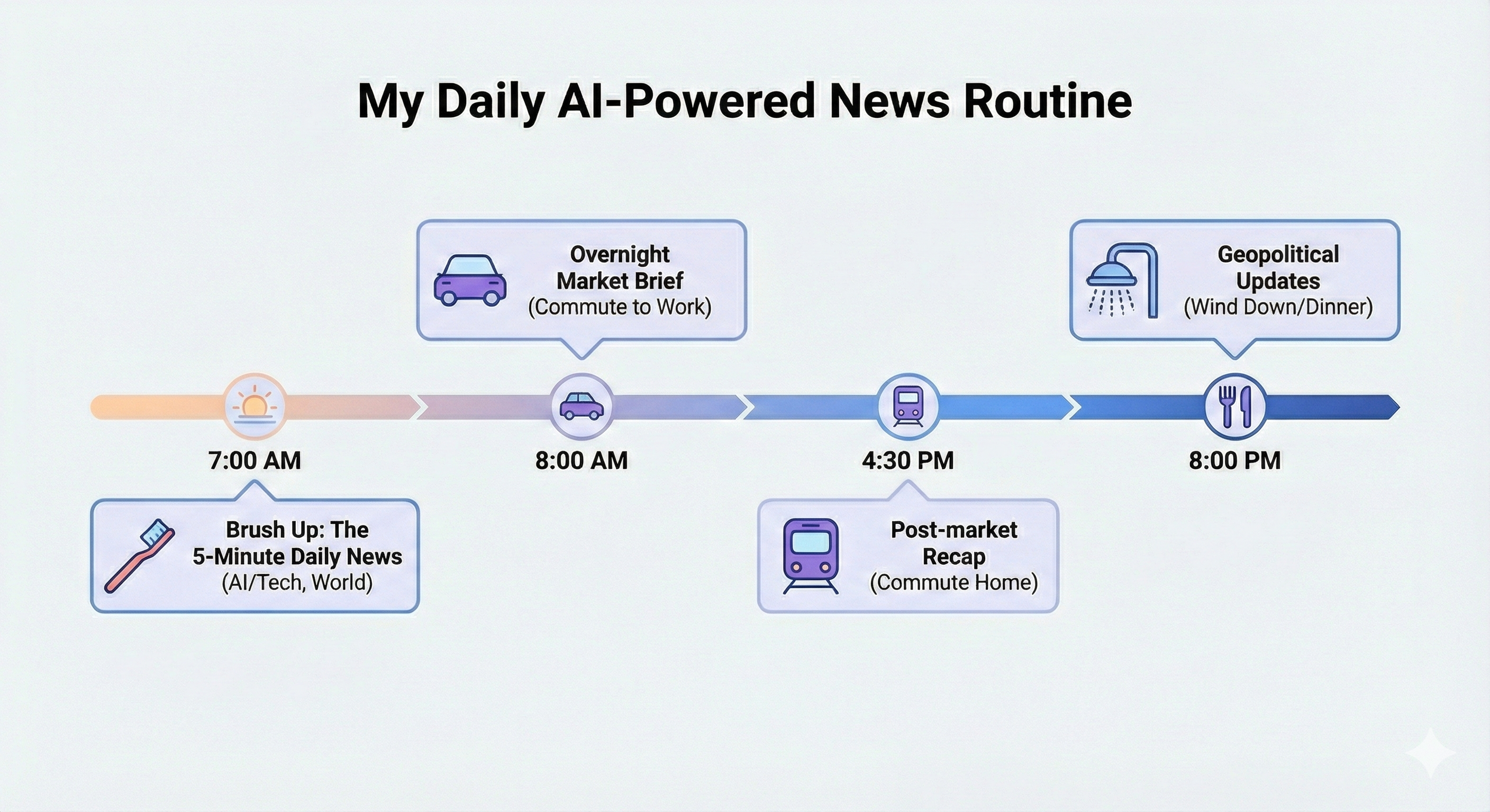 🌅 7:00 AM (The "Brush Up"): 5-minute AI/Tech & World news while getting ready. 🚗 8:00 AM (Morning Commute): Overnight Market Brief bridging global financial gaps. 🚋 4:30 PM (Evening Commute): Post-market Recap catching the closing data. 🚿 8:00 PM (Wind Down): Geopolitical Updates for a deeper end-of-day perspective.